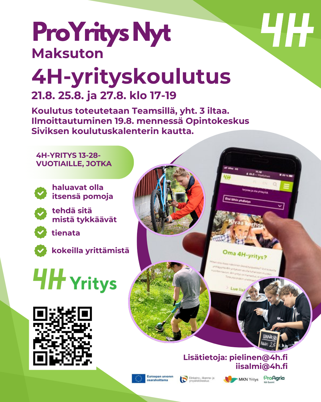 13–28-vuotias nuori, tienaa koulun ohella 4H-yrittäjänä! ProYritys Nyt -hankkeen maksuttomaan 4H-yrityskoulutukseen voi osallistua etänä myös meidän kuntamme nuoret. Tässä linkki ilmoittautumissivulle https://sivisverkko.ok-sivis.fi/#/koulutus/77429. Lisätietoja 4H-yrittämisestä löytyy tämän linkin kautta https://4h-akatemia.fi/toita-ja-toimintaa/4h-yrittajalle/. #proyritysnyt