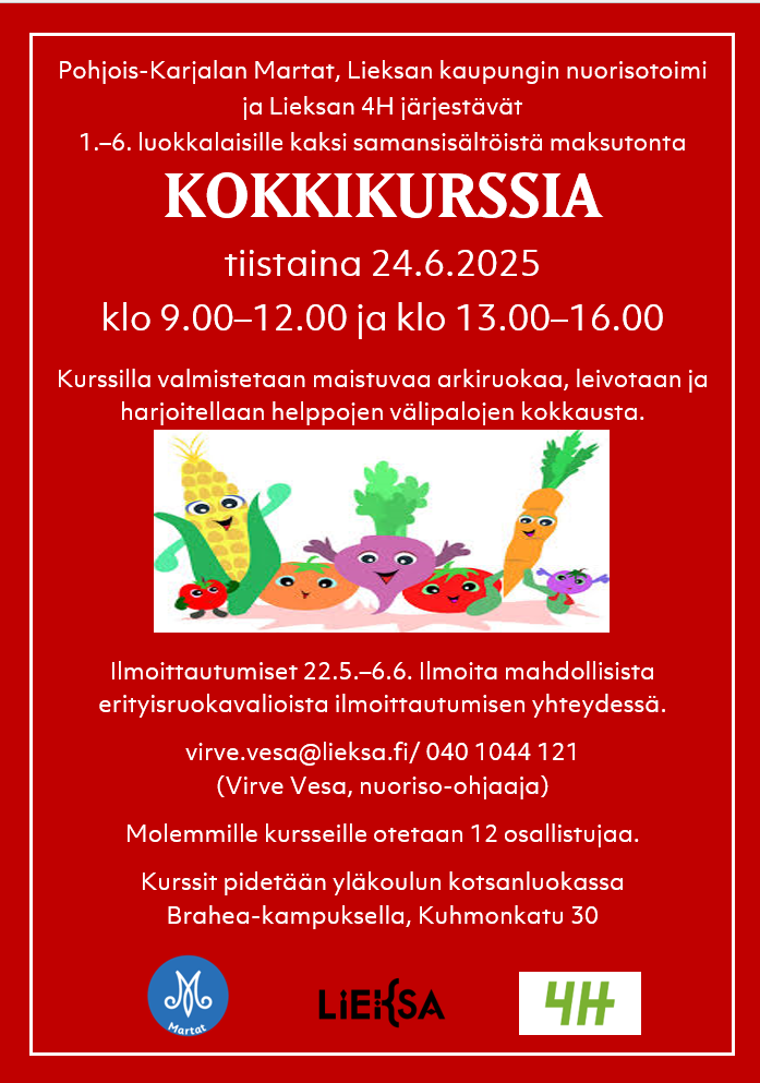 Mukaan mahtuu 12 kurssilaista. Ilmoittautumiset 6.6. mennessä virve.vesa@lieksa.fi/040 1044 121.